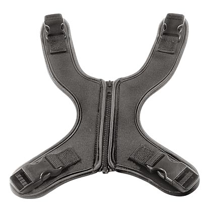 This chest harness offers quick release buckles at the top and bottom of the vest. Once the vest is in place on a chair, the front zipper unfastens to allow the user to get in and out of the vest without unfastening the buckles. Black lycra-covered neoprene with finished edges. Attaching hardware included. |